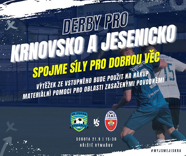 V sobotu 21. září se hráči SK Jiskra Rýmařov utkají na rýmařovském hřišti s týmem TJ Břidličná. Klub věnuje celý výtěžek ze vstupného na pomoc oblastem postižených povodněmi. Zároveň je organizována sbírka mezi hráči, trenéry, zaměstnanci a funkcionáři. Vybrané peníze budou přidány k výtěžku ze vstupného a použity na zakoupení prostředků pro odklízení škod způsobených živelnou pohromou.