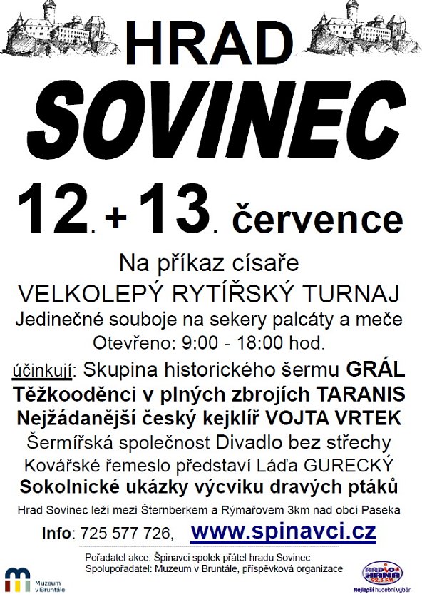 Ve dnech 12. – 13. 7. se bude na hradě Sovinci od 9:00 do 18:00 hodin konat velkolepý rytířský turnaj, vystoupení kejklířů, sokolníků, skupiny historického šermu a ukázky kovářského řemesla.