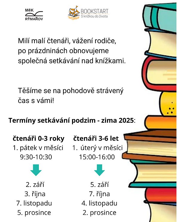 Navštivte Městskou knihovnu Rýmařov v pátek 3. října v 9:30 hodin. Rodiče s dětmi do 3 let čeká předčítání, tvoření, pohybové aktivity a tipy na knížky.