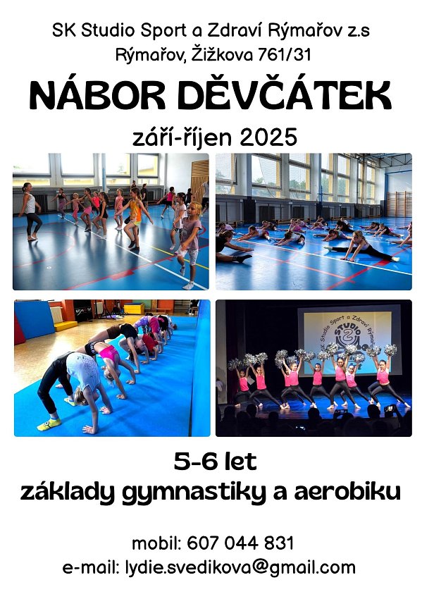 SK Studio Sport a Zdraví Rýmařov pořádá nábor dívek ve věku 5–6 let do cvičení základů gymnastiky a aerobiku. Přijďte se podívat a třeba si i poprvé zacvičit.